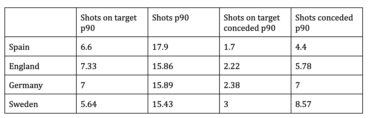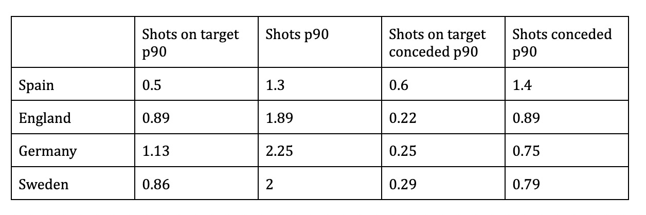 Yet when we look at the same fixtures across the full ninety minutes played, Spain do a lot better. Over the past year, Spain average more shots per 90 than the other three teams, conceding less shots on target and less shots generally. The only metric they fall down slightly on is shots on target.